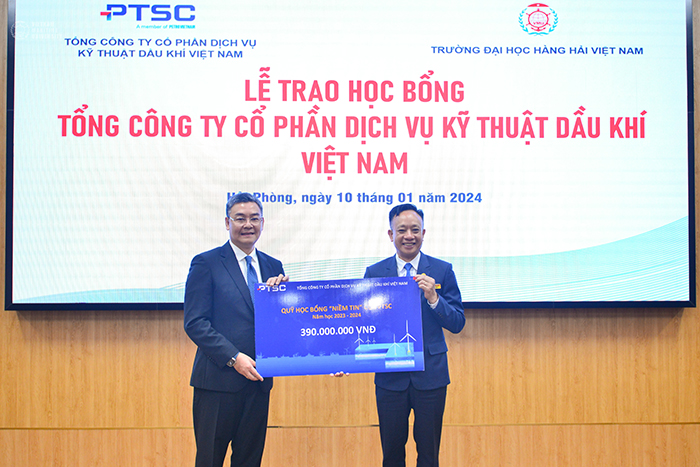 Thực hiện chương trình hợp tác giữa hai bên, Tổng Công ty PTSC đã triển khai Chương trình hỗ trợ tài chính với mục đích khích lệ tinh thần học tập và giúp đỡ các em sinh viên có hoàn cảnh khó khăn của Nhà trường. Trải qua đợt phỏng vấn ngày 21/11/2023, Tổng Công ty PTSC đã lựa chọn 26 sinh viên xuất sắc nhất từ 52 sinh viên thuộc Khoa Hàng hải, Khoa Máy tàu biển và Khoa Kinh tế để trao các suất học bổng với tổng trị giá lên tới 390 triệu đồng.