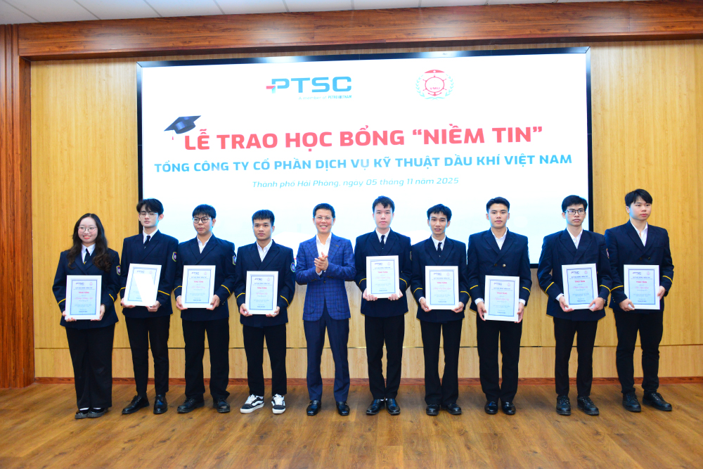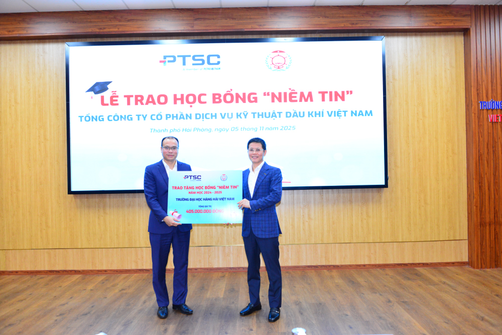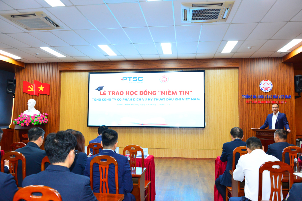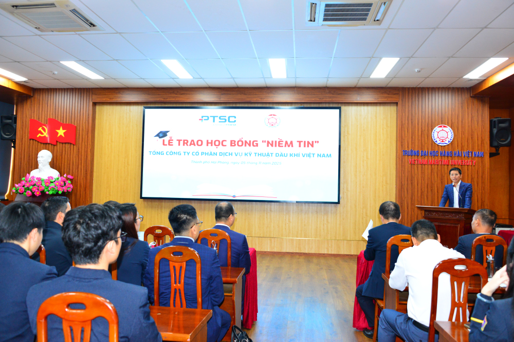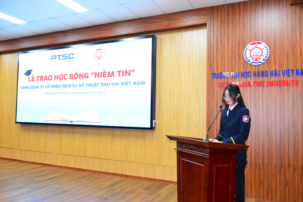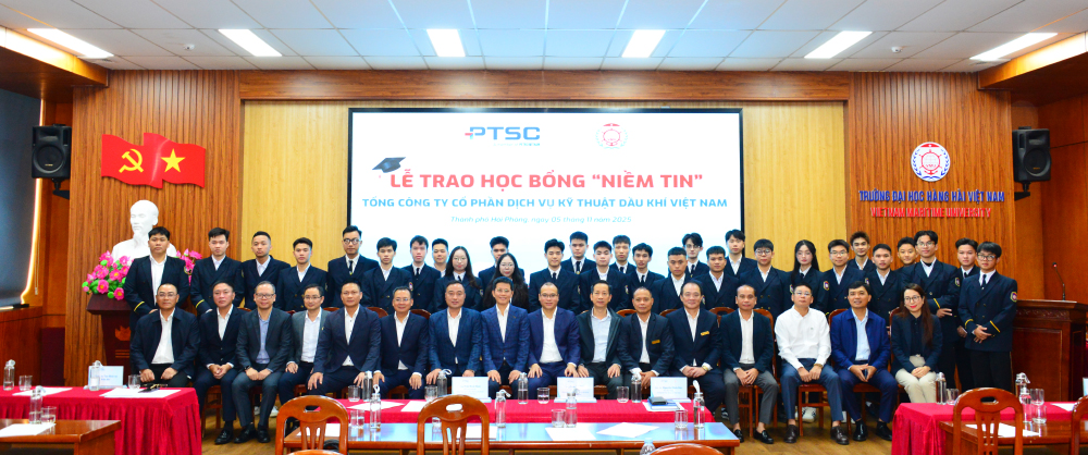 Sáng 05/11/2025, Trường Đại học Hàng hải Việt Nam (VMU) đã phối hợp với Tổng Công ty Cổ phần Dịch vụ Kỹ thuật Dầu khí Việt Nam (PTSC) tổ chức Lễ trao học bổng “Niềm tin” với tổng trị giá 405 triệu đồng dành cho các sinh viên có thành tích học tập và rèn luyện xuất sắc của Nhà trường.
