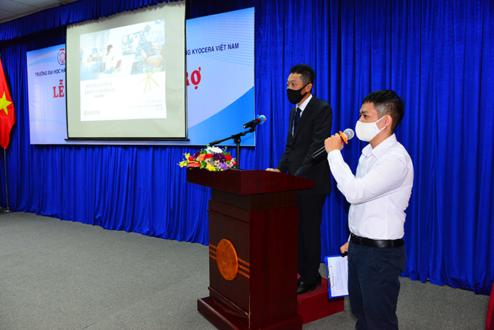 Phát biểu tại Lễ trao tài trợ, PGS.TS Trần Anh Dũng – Trưởng Khoa Điện – Điện tử cho biết: Trong những năm qua, Công ty Kyocera Việt Nam đã về Trường và Khoa Điện – Điện tử tổ chức nhiều quảng bá, giới thiệu về Công ty, đồng thời phỏng vấn tuyển dụng các sinh viên tốt nghiệp của Khoa về làm tại Công ty. Hai đơn vị cũng đã phối hợp tổ chức cho các sinh viên năm cuối đến thực tập tốt nghiệp tại Công ty, qua đó giúp các sinh viên tiếp cận với thực tế, trau dồi kiến thức chuyên môn và rèn luyện các kỹ năng nghề nghiệp. Các kiến thức và kỹ năng thực tế này rất quý báu cho sinh viên sau khi tốt nghiệp. Công ty Kyocera Việt Nam hàng năm cũng trao tài trợ học bổng cho các sinh viên của Khoa, mỗi năm có từ 2 đến 3 sinh viên nhận được học bổng của Công ty.