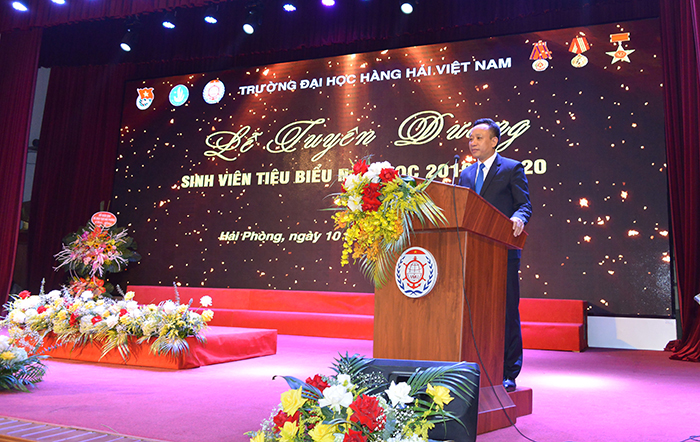 PGS. TS. Phạm Xuân Dương - Phó Bí thư Đảng ủy, Hiệu trưởng Trường Đại học Hàng hải Việt Nam phát biểu tại buổi lễ tuyên dương sinh viên tiêu biểu năm 2019-2020.