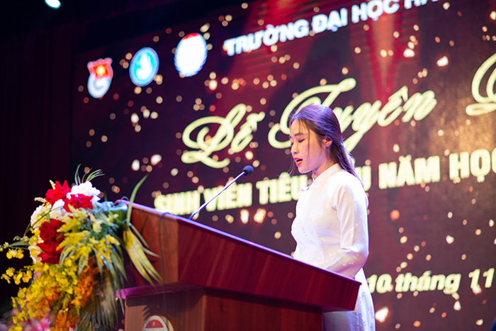 Sinh viên Vũ Thị Xuân Quỳnh – Lớp LQC58ĐH, Khoa Kinh tế – chuyên ngành Logistics và chuỗi cung ứng, Khoa Kinh tế đại diện cho các gương mặt sinh viên tiêu biểu được vinh danh phát biểu.