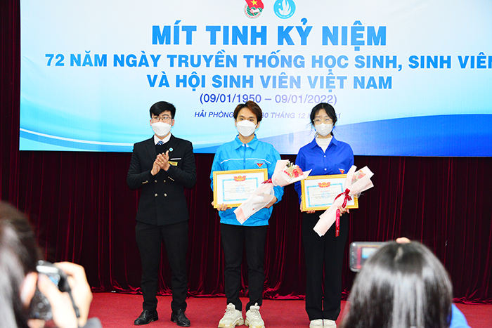 Đồng chí Vương Toàn Thu Thủy - Ủy viên BCH Trung ương Đoàn, Ủy viên Ban thư ký Trung ương Hội Sinh viên Việt Nam, Phó Bí thư Thành đoàn, Chủ tịch HSV Việt Nam thành phố và PGS.TS Nguyễn Minh Đức – UVBTV Đảng ủy, Phó Hiệu trưởng Nhà trường trao khen và hoa cho đại diện tập thể và các cá nhân được nhận Bằng khen của Thành đoàn Hải Phòng.