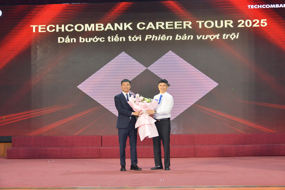 ThS. Vũ Minh Ngọc - Trưởng phòng Công tác sinh viên kiêm Giám đốc Trung tâm Đào tạo và Giới thiệu việc làm Trường Đại học Hàng hải Việt Nam và Ông Tăng Tiến Sơn - Giám đốc Trung tâm Dịch vụ việc làm Hải Phòng tặng hoa tri ân các doanh nghiệp đã đồng hành cùng Ngày hội việc làm lần 2 năm 2025