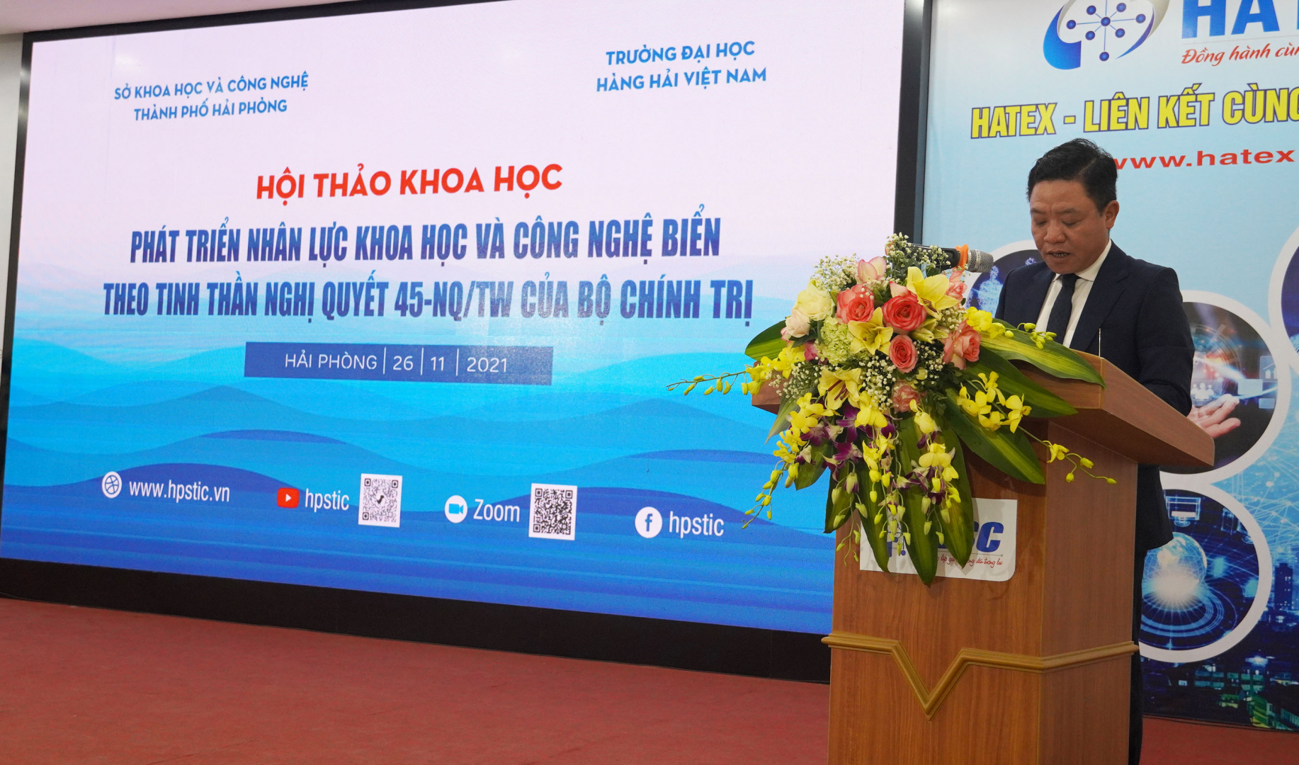 Sáng 26/10, Trường Đại học Hàng hải Việt Nam phối hợp với Sở Khoa học và Công nghệ (KH&CN) tổ chức hội thảo khoa học “Phát triển nhân lực KH&CN biển theo tinh thần Nghị quyết số 45-NQ/TW của Bộ Chính trị” theo hình thức trực tiếp và trực tuyến - kết nối đa nền tảng trên Zoom và Youtube. Đồng chủ trì hội thảo là PGS.TS. Phạm Xuân Dương - Hiệu trưởng Trường Đại học Hàng hải Việt Nam và TS. Trần Quang Tuấn - Giám đốc Sở KH&CN. Tham dự hội thảo, về phía Trung ương, có đại diện Viện Kinh tế Việt Nam - Viện Hàn lâm khoa học xã hội Việt Nam, Học viện Khoa học công nghệ và đổi mới sáng tạo, Viện nghiên cứu và phát triển Vùng và các đơn vị thuộc Bộ Khoa học và Công nghệ, Đại học kinh tế - Đại học Quốc gia Hà Nội...; Về phía thành phố Hải Phòng có lãnh đạo các viện nghiên cứu, trường đại học, sở, ban, ngành và doanh nghiệp liên quan...