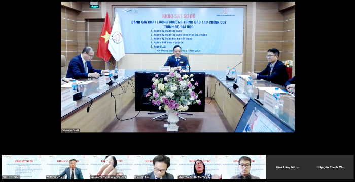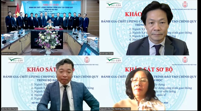 Sáng 03/01/2025, Trung tâm Kiểm định chất lượng giáo dục - Đại học Quốc gia Hà Nội (KĐCLGD - ĐHQGHN) phối hợp cùng Trường Đại học Hàng hải Việt Nam tổ chức Khảo sát sơ bộ đánh giá chất lượng 05 chương trình đào tạo chính quy trình độ đại học theo tiêu chuẩn của Bộ Giáo dục và Đào tạo: ngành Kỹ thuật xây dựng, ngành Kỹ thuật xây dựng công trình giao thông, ngành Kỹ thuật điện tử viễn thông, ngành Kinh doanh quốc tế, ngành Luật (theo Thông tư 04/2016/TT-BGDĐT). Buổi Khảo sát sơ bộ được tổ chức dưới cả hai hình thức trực tiếp và trực tuyến trên nền tảng Zoom.