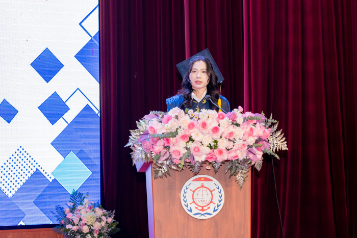 Trong niềm vui ngày tốt nghiệp, sinh viên Vũ Thị Thu Trang - VTT61ĐH đại diện cho các tân kỹ sư, tân cử nhân phát biểu, bày tỏ lòng biết ơn sâu sắc tới gia đình cùng toàn thể các Thầy, Cô trong Ban lãnh đạo Nhà trường, lãnh đạo các Phòng, Ban, Khoa, Viện và các cán bộ, chuyên viên Nhà trường vì đã luôn lắng nghe, thấu hiểu và đồng hành trong suốt những năm qua, tạo nên môi trường học tập đáng mơ ước để sinh viên trau dồi và rèn luyện. Chính sự yêu thương, quan tâm của các thầy, cô, các bậc phụ huynh, sự vị tha với những sai lầm của tuổi trẻ, sự ủng hộ những ước mơ, hoài bão và luôn dõi theo bước đường các con đi, là động lực lớn, giúp các bạn tân kỹ sư, tân cử nhân vượt qua những khó khăn, thử thách.