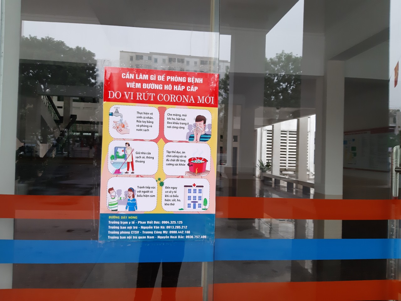 Các bảng chỉ dẫn theo khuyến cáo của Bộ Y tế được niêm yết tại những vị trí dễ quan sát nhằm nâng cao nhận thức, đưa ra các khuyến cáo, chỉ dẫn cho cán bộ, giảng viên, sinh viên. Kèm theo đó là số điện thoại đường dây nóng để mọi người gọi hỏi tư vấn khi cần.