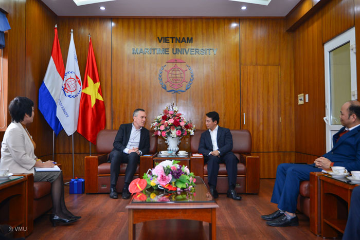 Tại buổi làm việc, PGS. TS. Nguyễn Thanh Sơn, Phó Hiệu trưởng Nhà trường gửi lời cảm ơn sâu sắc về sự hỗ trợ của đất nước Hà Lan cho công tác đào tạo và huấn luyện của Nhà trường trong những năm vừa qua. Bên cạnh các chương trình tài trợ cán bộ, giảng viên của Nhà trường tham dự tham dự khóa đào tạo ngắn hạn tại Hà Lan, Nhà trường cũng được tiếp nhận chuyên gia tư vấn từ các cơ quan, tổ chức Hà Lan sang làm việc tại Nhà trường, hỗ trợ nâng cấp các chương trình đào tạo, chuyển giao kiến thức, công nghệ. Trong Chương trình Đối tác kinh doanh (PIB -Partner for International Business Program) do Chính phủ Hà Lan bảo trợ đối với lĩnh vực vận tải thủy Hà Lan – VINWAP, Trường Đại học Hàng hải Việt Nam tham gia là thành viên chính cùng với các đơn vị khác bao gồm: Cục Đường thủy nội địa Việt Nam, Cục Hàng hải Việt Nam, Tập đoàn tư vấn Royal Haskoning DHV, Cảng Rotterdam, Viện thủy lực Deltares, Viện nghiên cứu hàng hải Marin, Công ty STC International,…, đã tích cực triển khai các hoạt động và góp phần tạo nên những thành công bước đầu của Chương trình. PGS.TS.Nguyễn Thanh Sơn mong muốn được ĐSQ Vương quốc Hà Lan tại Việt Nam tiếp tục ủng hộ các giai đoạn tiếp theo của Chương trình.