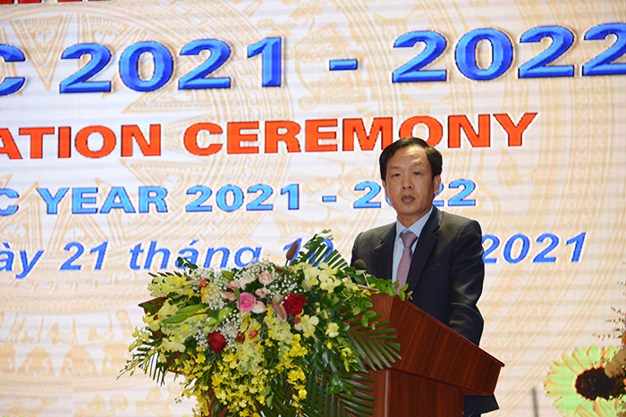 PGS.TS Phạm Xuân Dương – Phó Bí thư Đảng uỷ, Hiệu trưởng Nhà trường đọc diễn văn khai giảng năm học 2021-2022.