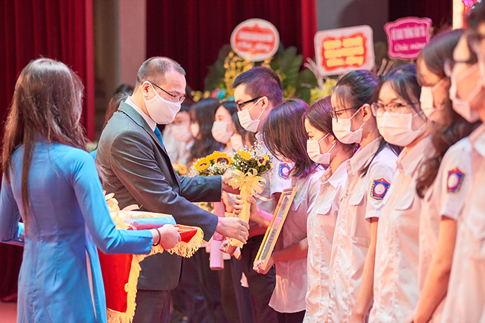 PGS.TS Nguyễn Minh Đức – UV Ban Thường vụ, Phó Hiệu trưởng Nhà trường trao Quyết định khen thưởng cho 16 tân sinh viên có điểm xét tuyển cao trong kỳ thi tuyển sinh năm học 2021-2022 trong đó có 1 em sinh viên là thủ khoa.